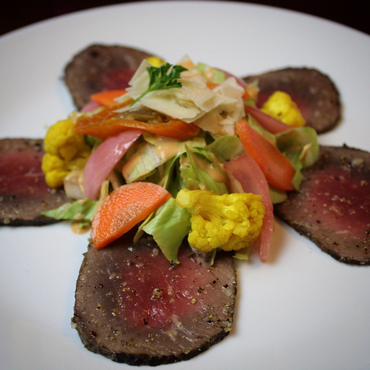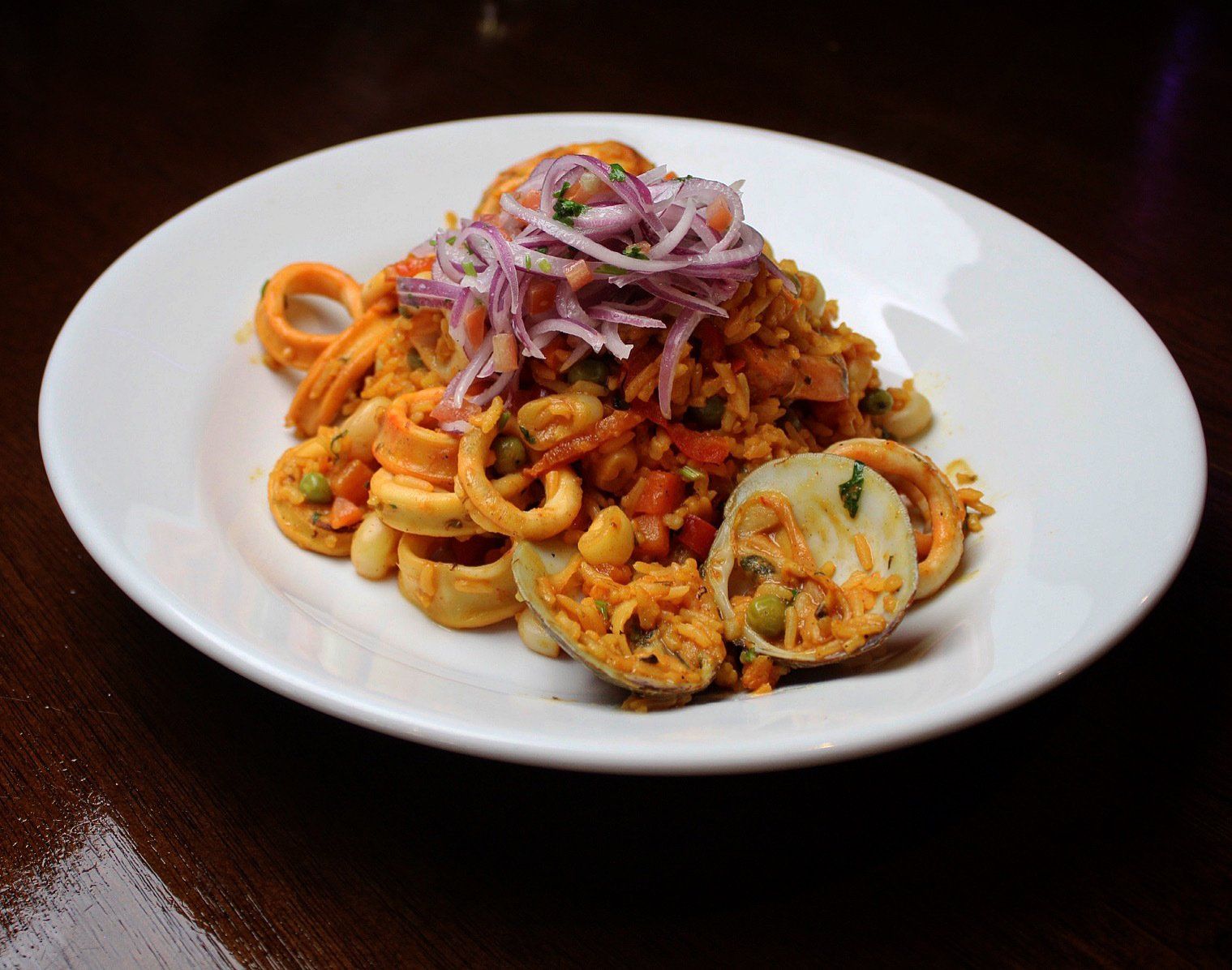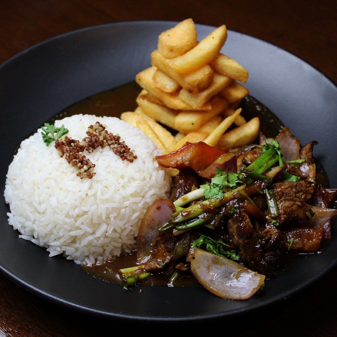 Stir fry steak - onions - tomatoes - tamari soy sauce - hand cut fries - rice.